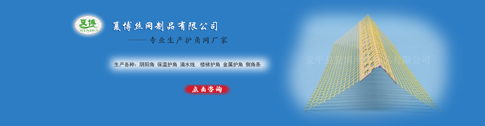 河北省安平縣夏博絲網制品有限公司旗下安平縣晟友絲網制品廠(原晟昌絲網制品廠)位于中國有名的“絲網之鄉”—安平,周圍與北京、天津、 石家莊等多個城市相交接,交通十分便利,可以往全國各地發貨。公司現有建筑墻角裝飾為"角歐樂"。  本廠創建于2010年,公司追求優質的產品,以質量為基礎,施工方便快捷為主,研發各種新型建筑 、裝飾所用的建材產品。夏博公司現有產品:油漆工專用陰、陽角PVC護角條、可彎護角,圓弧護角條,泥水工專用內外墻保溫護角、樓梯護角、外墻分隔...
